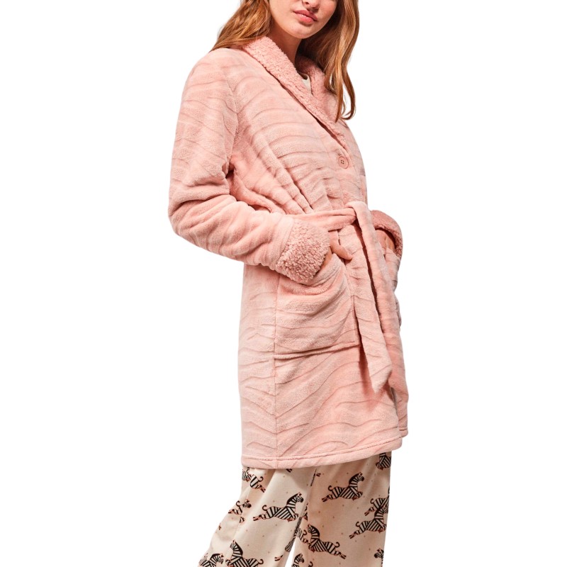 Bata de casa para mujer de Gisela. Modelo confeccionado en tejido peluche con detalle de borreguillos en los puños y en la solapa. Cierre de botones y cinturón.