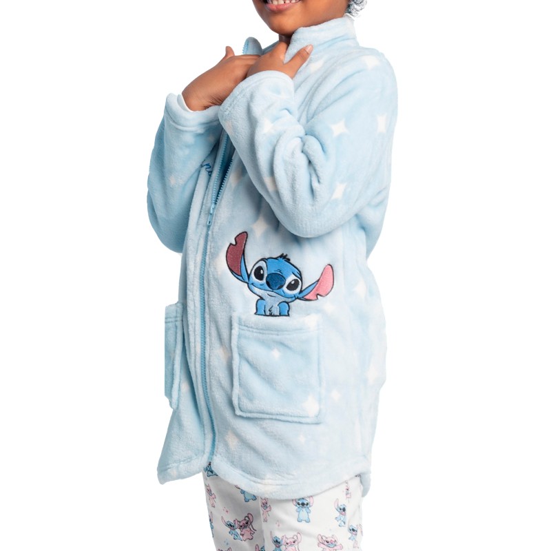 Bata para niña de Coralina suave estampada de estrellas. Lleva detalle de Stich bordado en el bolsillo. Cierre delantero de cremallera. Muy cálida y amorosa.