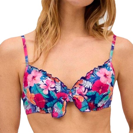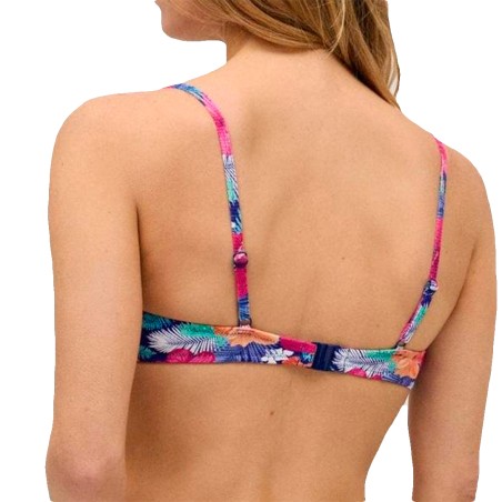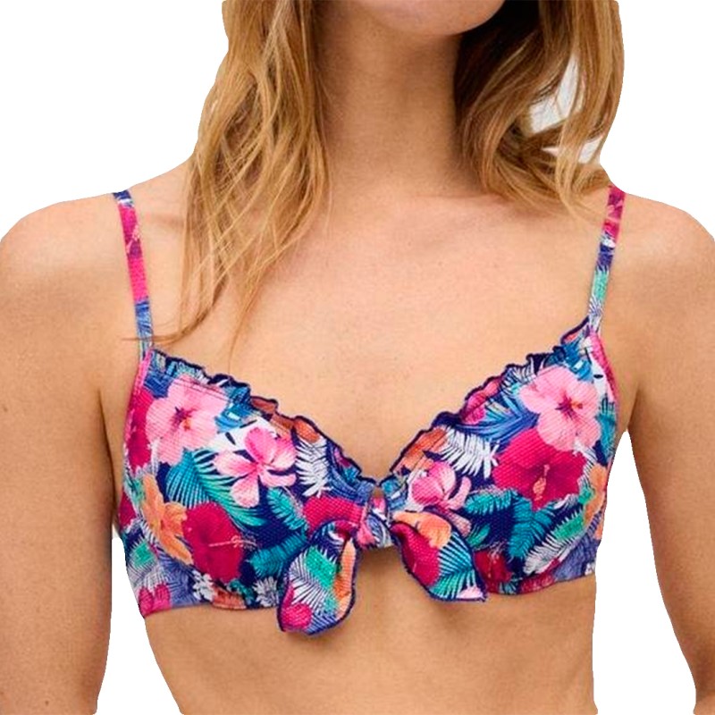 Top bikini Ysabel Mora copa B con aro y relleno. Modelo confeccionado en tejido estampado de flores tropicales. Lleva tirantes ajustables y cierre trasero con broche. Combínalo con braguitas de la colección.