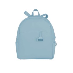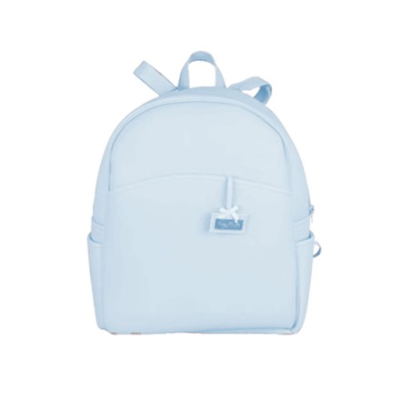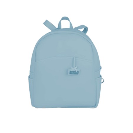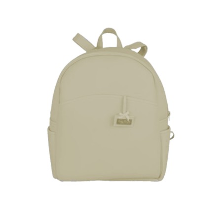 Mochila de Rosy Fuentes fabricada en ecopiel gofrada de círculos. Las mochilas son un complemento extra cómodo para llevar todo lo necesario para el bebé ya que las puedes poner a la espalda dejando las manos libres. Con bolsillos organizadores.