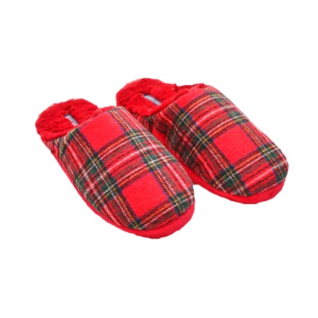 Zapatilla para mujer de Ysabel Mora. Modelo Navideño confeccionado en tejido de cuadro rojo y verde con interior de pelo muy suave y cálido.