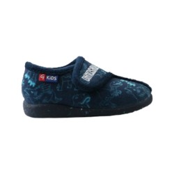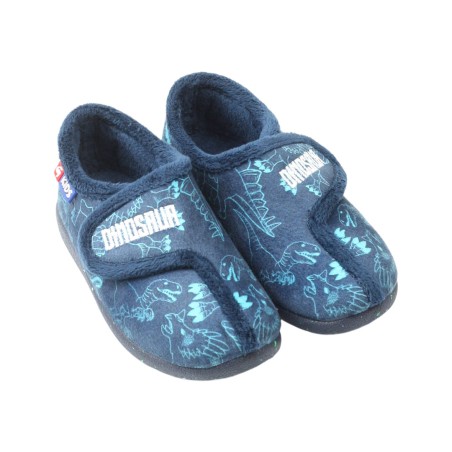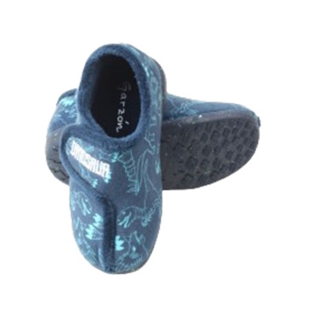Zapatilla cerrada para niños de Garzón. Modelo confeccionado en tejido divertido de dinosaurios. Lleva cierre de velcro para un mejor ajuste y suela de goma antideslizante.