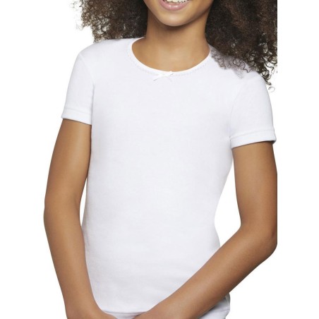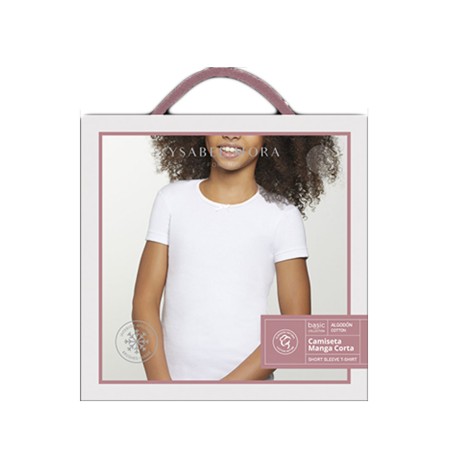 Camiseta de algodón para niña de Ysabel Mora. Manga corta e interior afelpado. Escote redondo con lazo y puntilla de adorno. Tejido antialergénico. Composición: 100% Algodón.