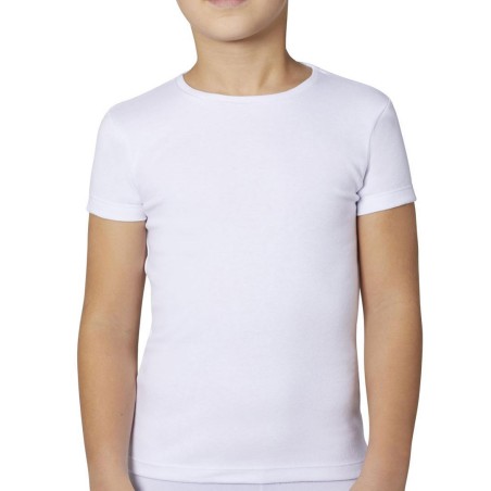 Camiseta para niño de algodón de ysabel Mora. Manga corta, interior felpado y con escote redondo. Tejido antialergénico. Composición: 100% Algodón.