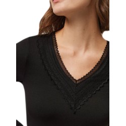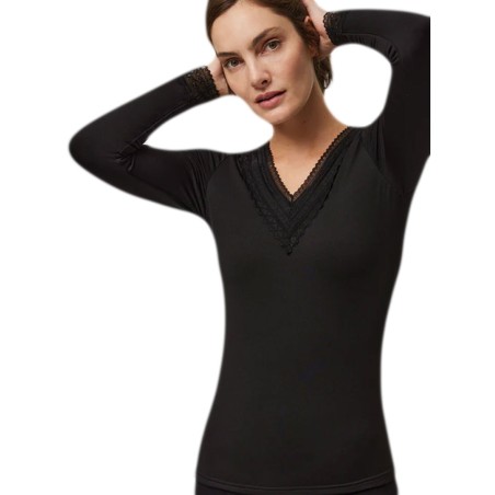 Camiseta térmica para mujer de Ysabel Mora. Elegante modelo con cuello pico .Escote y mangas con detalle de encaje.