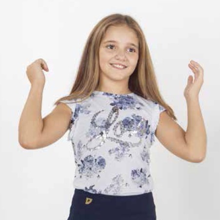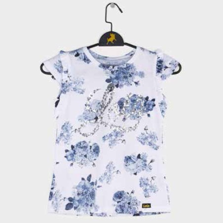 Camiseta Lois de manga corta para niña, tejido estampado con flores azules y detalles plateados.