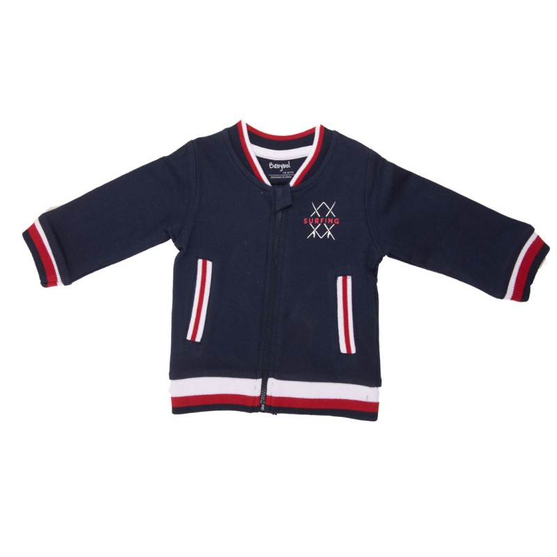 Chaqueta para niño de Baby-Bol en color marino con puños y cuello a contraste de rayas. Cierre con cremallera y bolsillos a ambos lados.