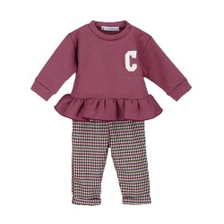 Conjunto informal de Calamaro para niña. Consta de 2 piezas. Parte de arriba tipo sudadera con letra en el pecho y detalle de volante en la parte de la cadera. Pantalón largo de cuadros a juego,