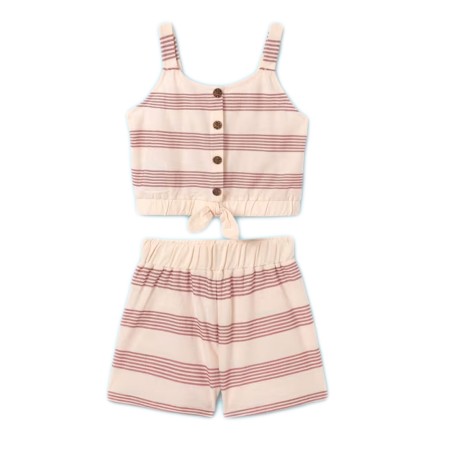 Conjunto de Mayoral para niña. Con estampado de rayas, parte de arriba tipo top con tirante ancho, botones delanteros y detalle de nudo en cintura. Pantalón corto a juego. Composición: 88% Algodón, 12% Poliéster