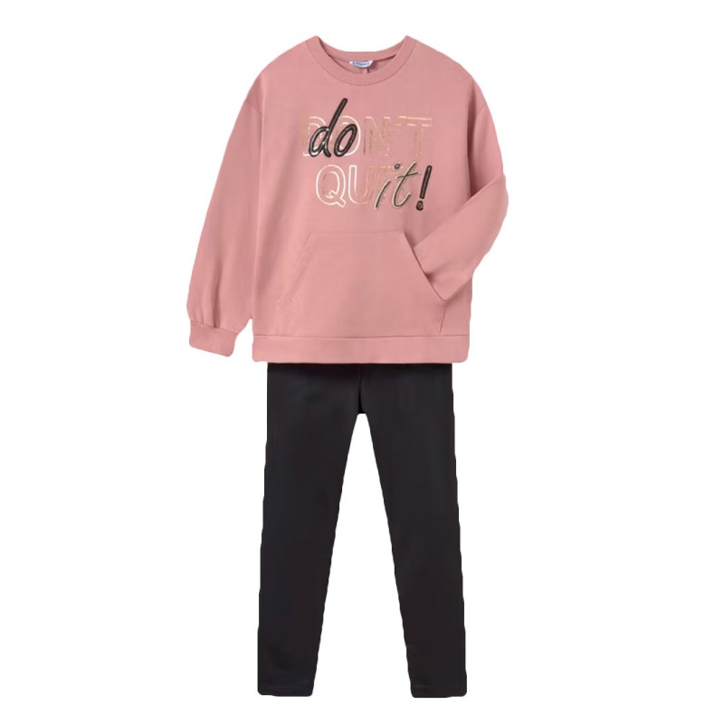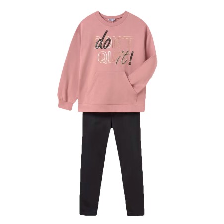 Conjunto de legging para niña de Mayoral. Sudadera larga con bolsillos tipo canguro y letras en el frente. Legging largo con apariencia brillante.