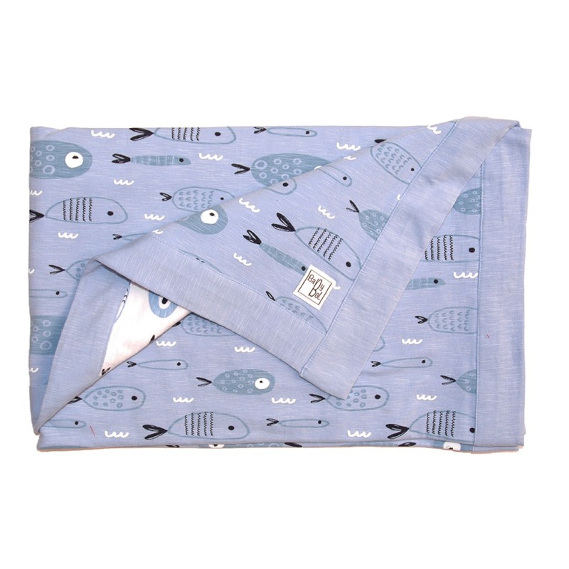 Manta arrullo para bebé de Baby-bol. Modelo fabricado en tejido de algodón con estampado de peces por ambos lados. Una manta ligera y muy cómoda para primavera-verano.