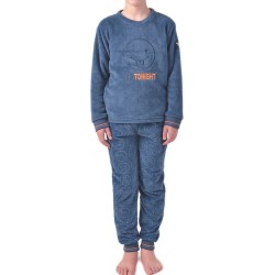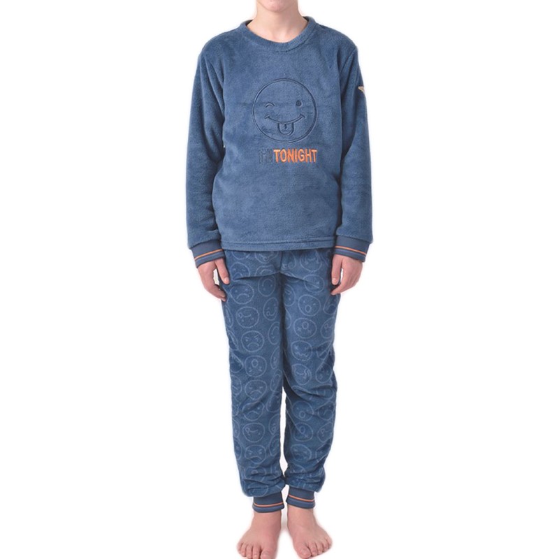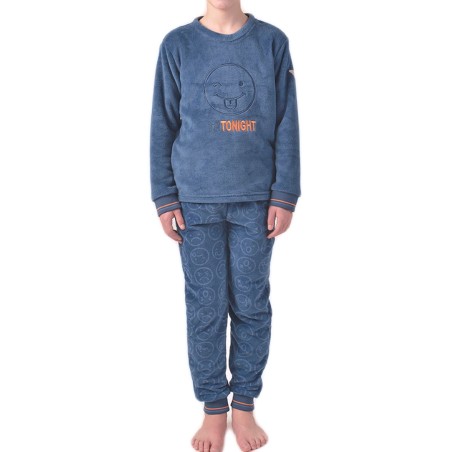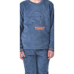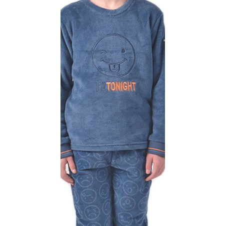 Pijama de coralina para niños de Privata. Modelo suave y cálido con camiseta lisa con carita de Smiley y pantalónen estampado de caritas de Smiley. Ideal para los días más fríos.