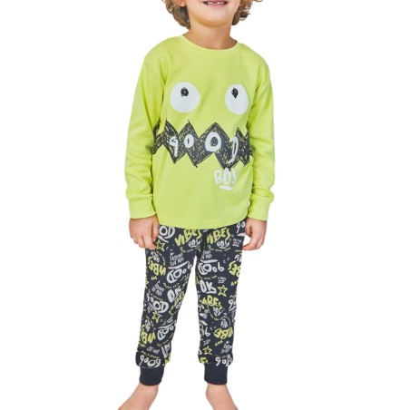 Pijama niño algodón Good Boy. Modelo con camiseta divertida con print de ojos y frase " Good Boy". Pantalón estampado de grafittis con puño para un mejor ajuste. Alegre y colorido.