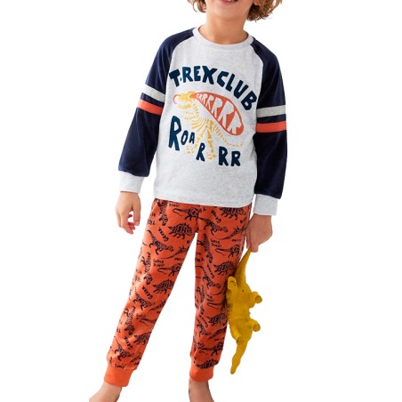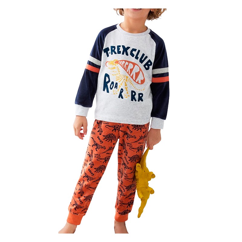 Pijama de Tobogán para niños confeccionado en tejido de algodón tondosado. Pantalón de dinosaurios y camiseta con print de letras y dinos. Mangas a contraste. Lleva puños y cintura elástica.
