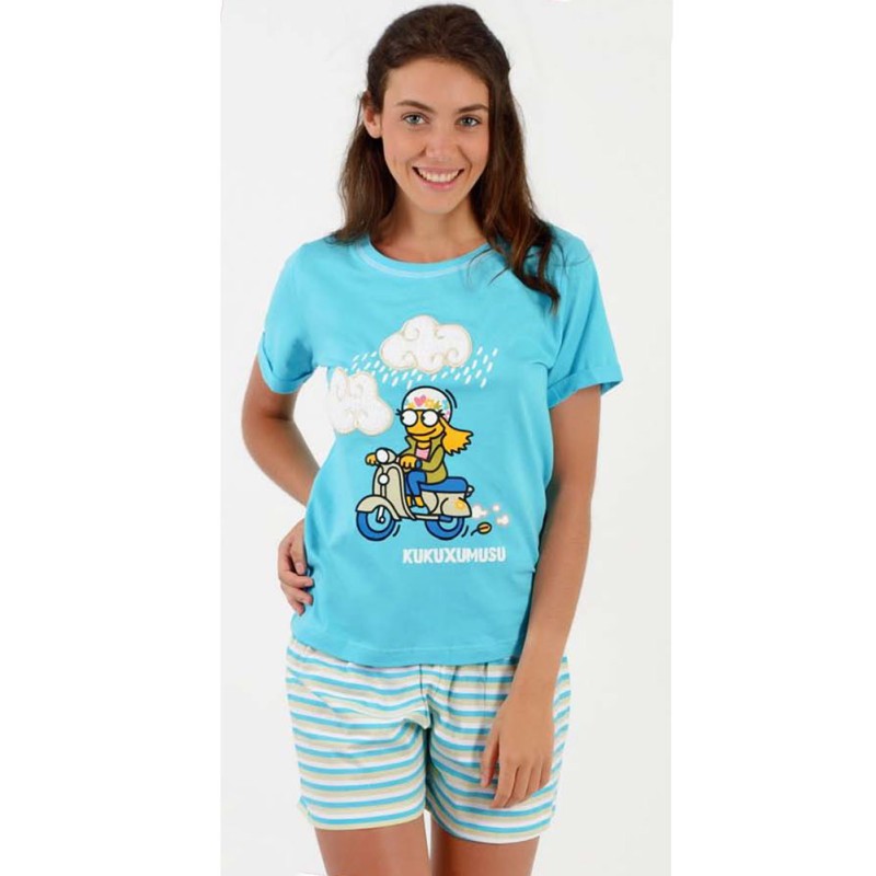 Pijama mujer Kukuxumusu "Kukino". Camiseta cuello redondo y short. Composición: 100% Algodón.