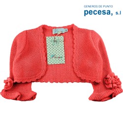 Chaqueta manga tres cuartos de pecesa. No lleva botones y las mangas están adornadas con volante y una flor.