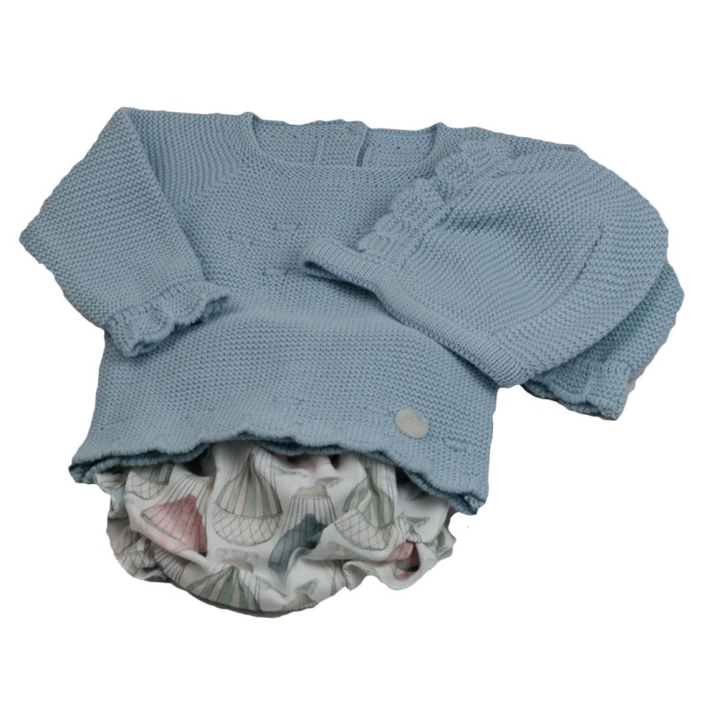 Conjunto para bebé de punto de Prim Baby. Modelo con jersey liso y campota de punto. braguita en tejido de globos.