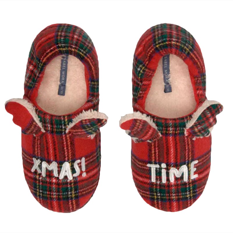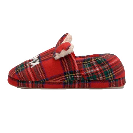 Zapatilla navideña de casa para niños de Ysabel Mora. En color rojo con cuadros navideños, con detalle de orejas y elástico en el talón. Forro de borreguito en el interior y suela rígida.